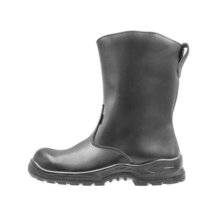 Botte d’hiver à doublure chaude en Teddy. Dessus en cuir revêtu PU hydrofuge et résistant. Semelle en polyuréthane tenant parfaitement le gel et résistant aussi à l’huile et à de nombreux produits chimiques. Forme large XL.