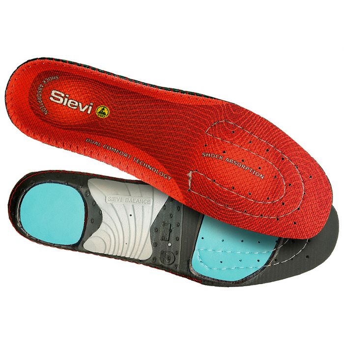 La semelle Dual Comfort Plus consiste en une couche de surface supérieure faite dans une matière agréable au contact, une couche intermédiaire séchant rapidement et une couche inférieure amortisseuse en EVA. Les parties du talon et du capiton comportent un coussin en PORON® qui amortit les chocs extérieurs. Elle intègre également un soutien de voûte plantaire SieviBalance® renforçant sa tenue à la torsion. Antistatique et agréée ESD. Doit être lavée à la main.
